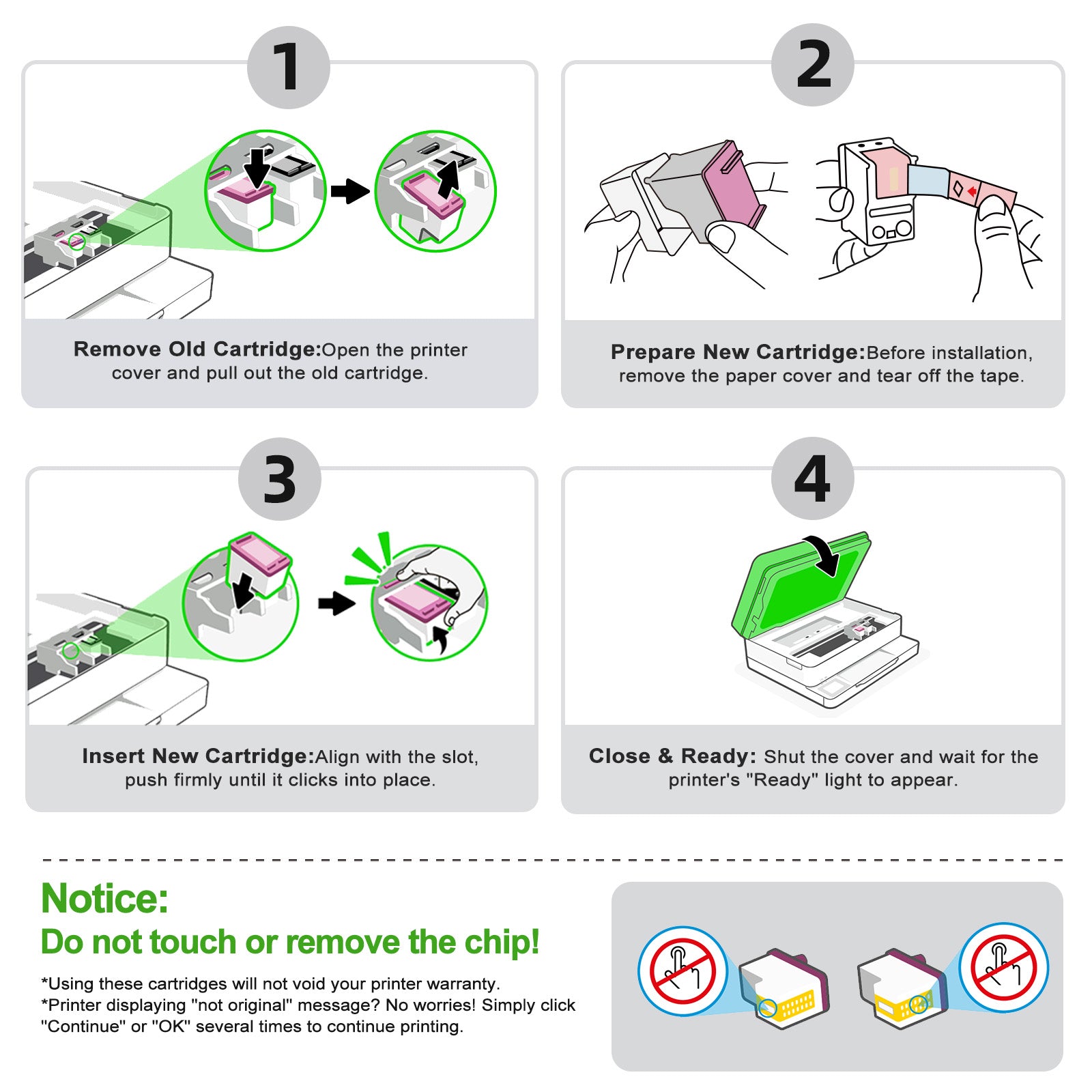 - Equipped with the latest upgraded chips to ensure compatibility which will effectively reduce the trouble caused by unrecognized cartridges