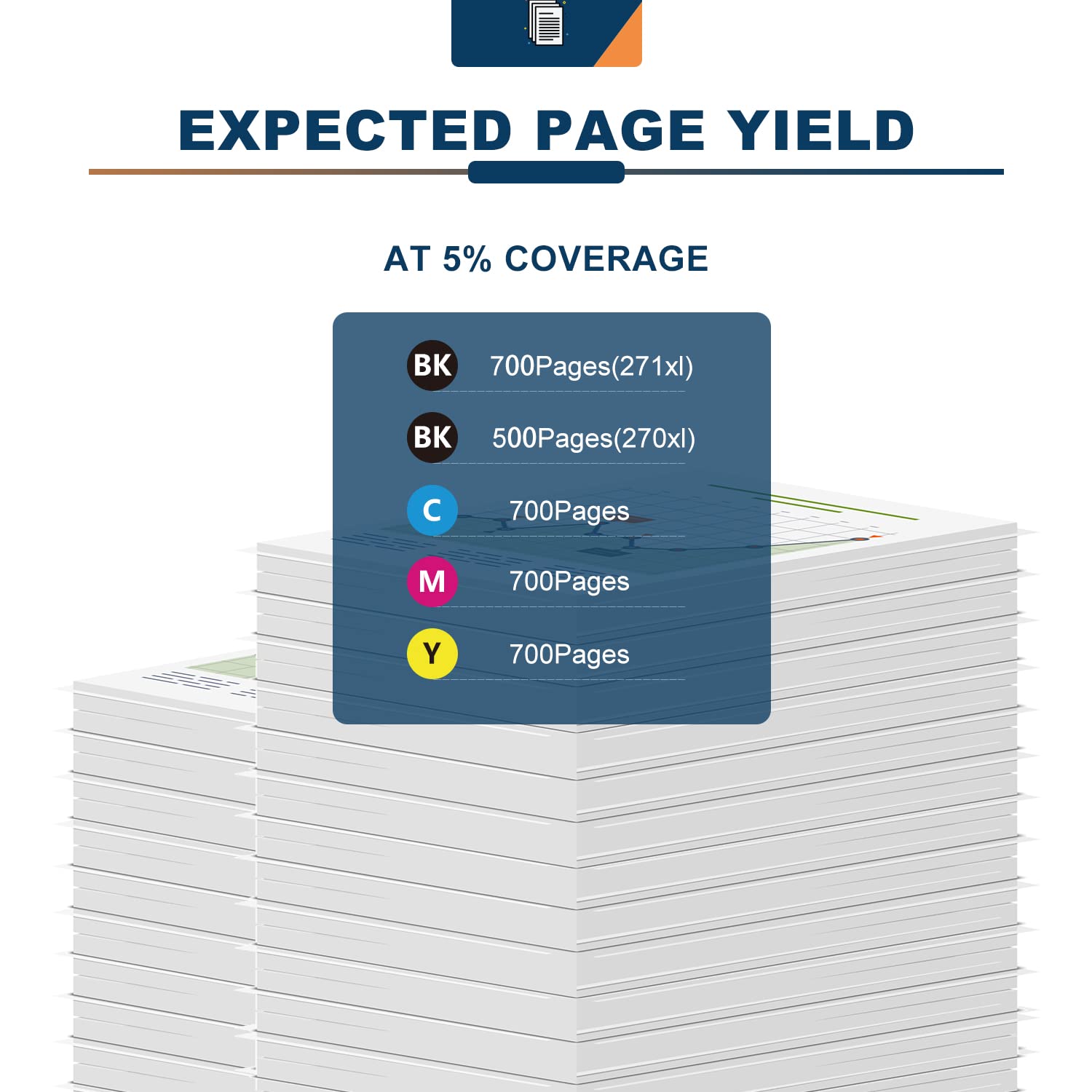 • Page Yield: PGI-270XL ( Pigment Black) is 500 pages per cartridge and CLI-271XL (Color) is 700 Pages per cartridge at 5% coverage